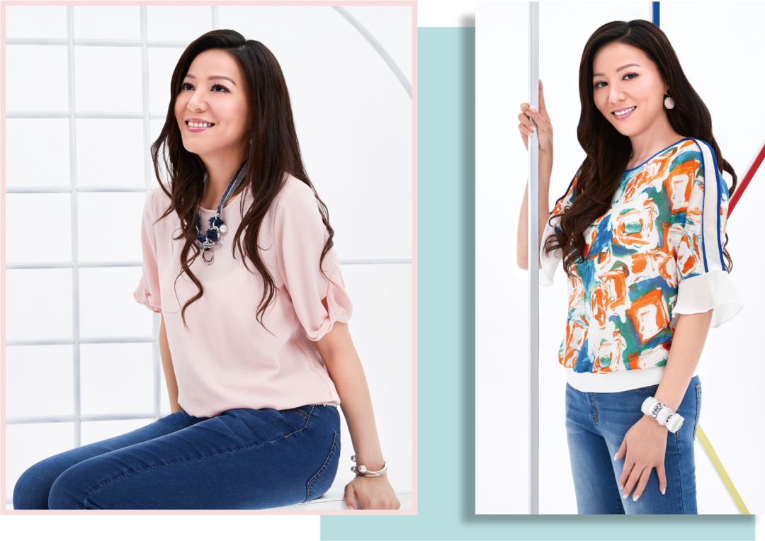 粉色上衣配上靛蓝牛仔裤