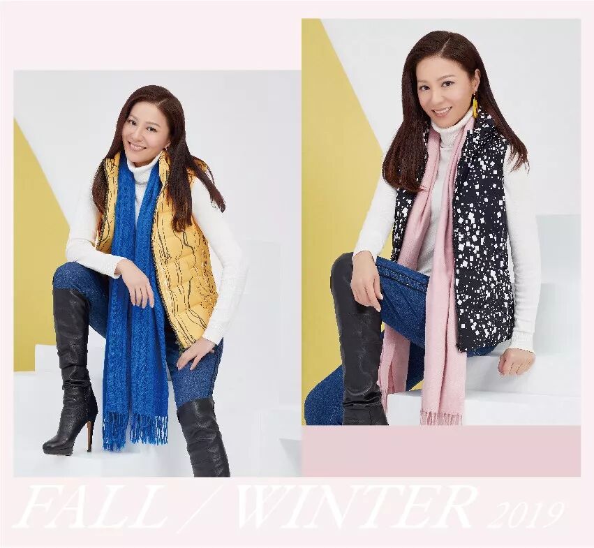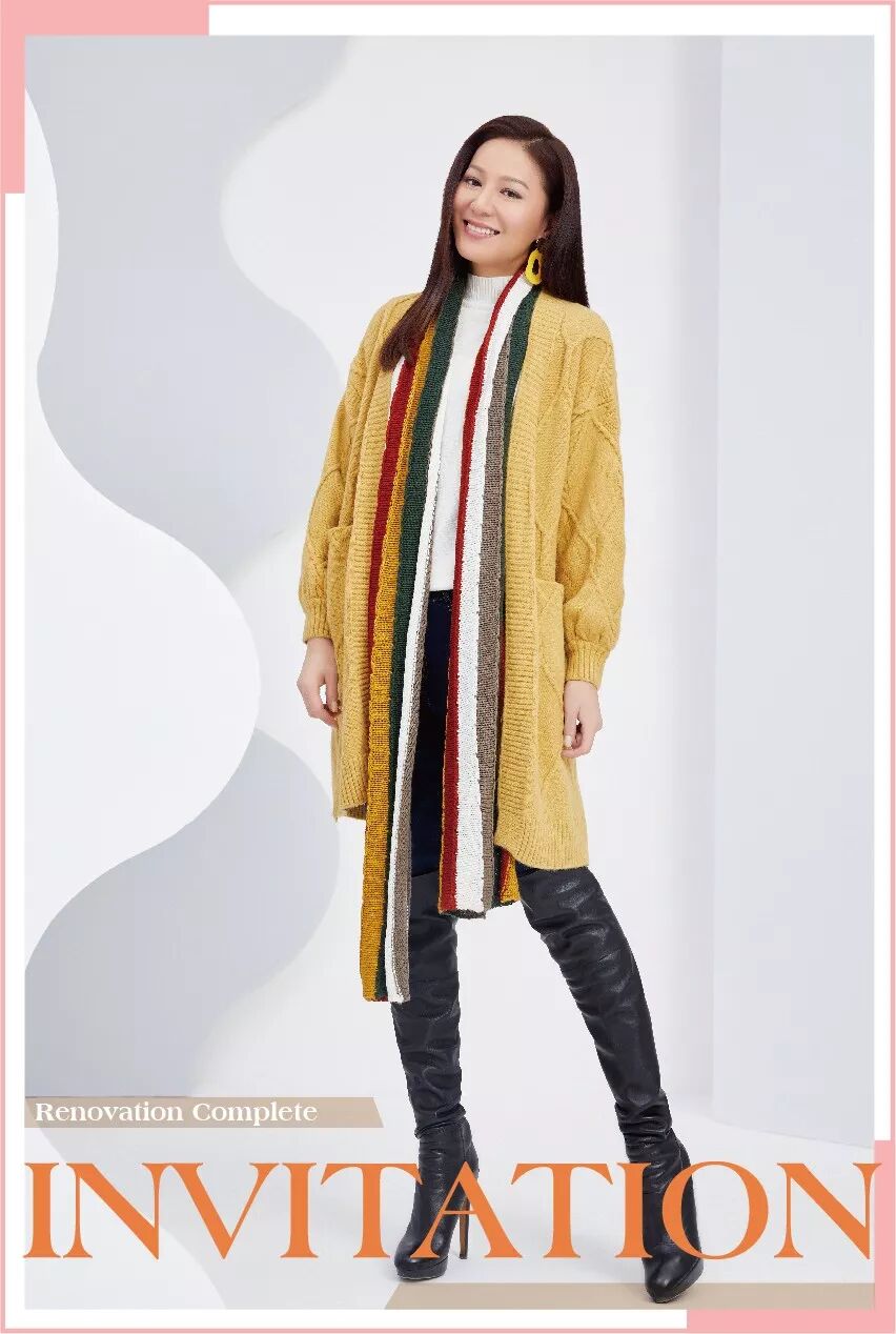 黄色长款外衣配上彩虹围巾